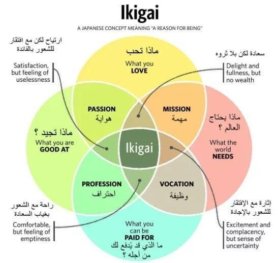 فإذا ترابطت إجابات تلك الأسئلة و حدث توافق بين الدوائر الأربعة حينها ستكون وجدت الايكجاي الخاص بك و هو ما سيدفعك للإستماع بحياتك.